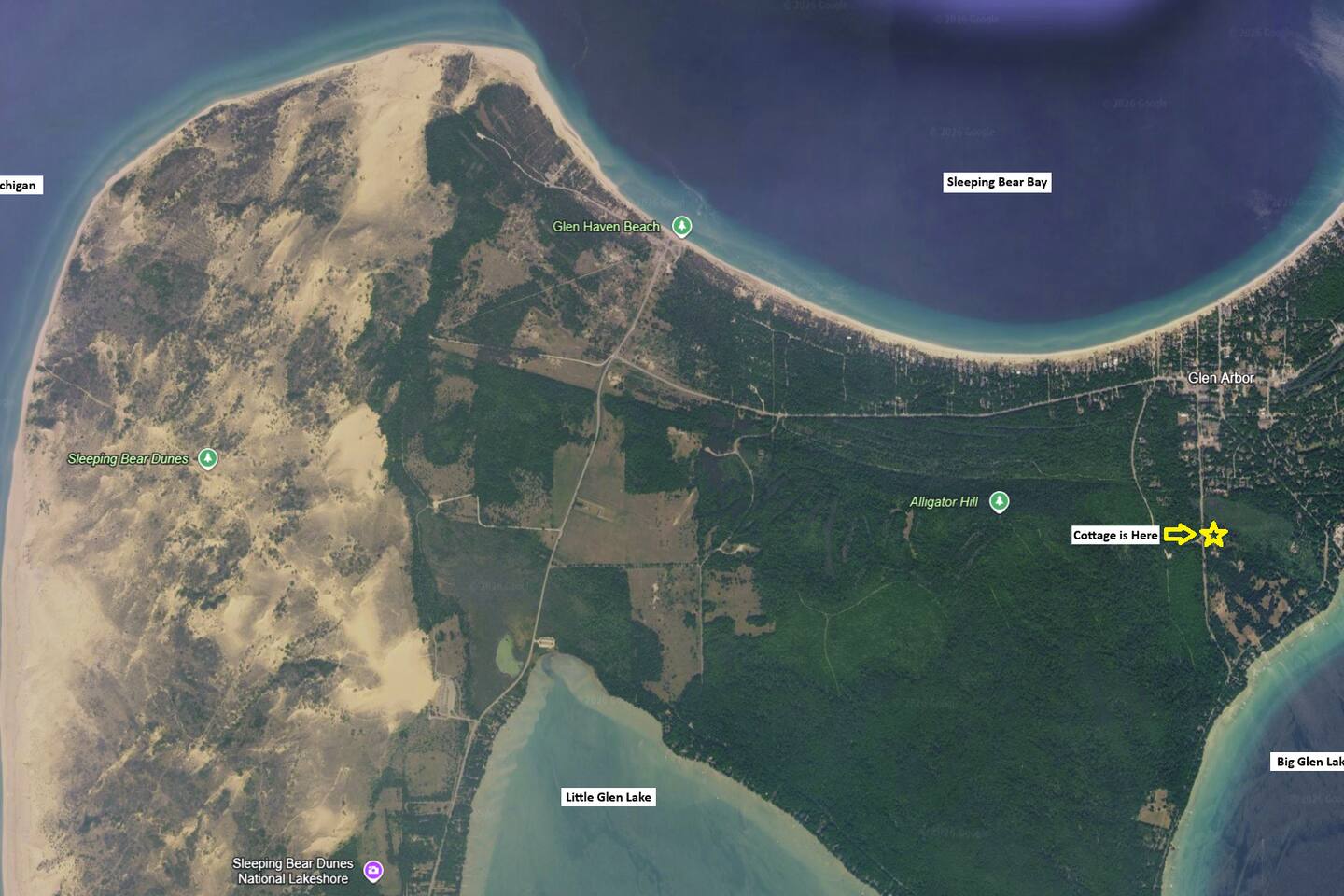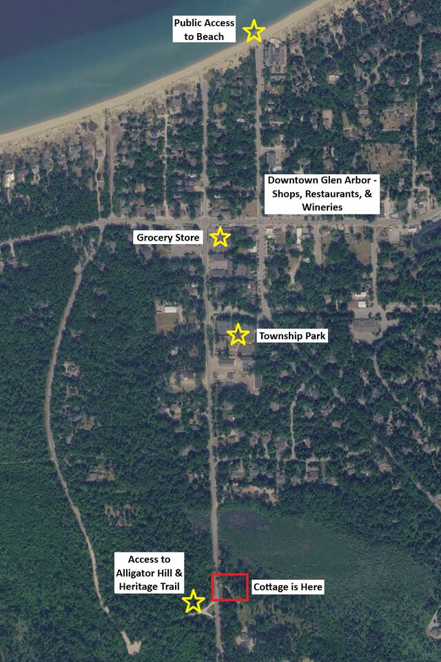 Cranberry Lodge is located 1/2 mile from downtown Glen Arbor. Cranberry Lodge is part of Cranberry Ridge, and just across the natural bog where our other four individual cozy cottages are located. Sleeping Bear Dunes and Lake Michigan beaches are approximately 2 miles away from the property.